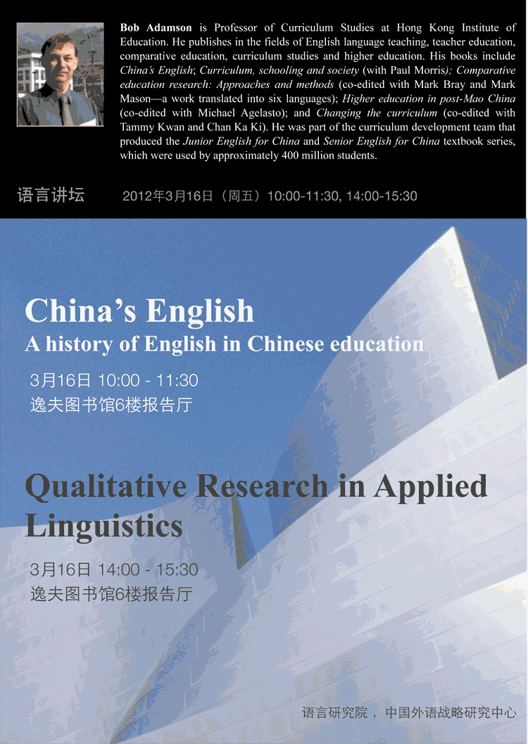 Bob Adamson is Professor of Curriculum Studies at Hong Kong Institute of Education. He publishes in the fields of English language teaching, teacher education, comparative education, curriculum studies and higher education. His books include China’s English; Curriculum, schooling and society (with Paul Morris); Comparative education research: Approaches and methods (co-edited with Mark Bray and Mark Mason—a work translated into six languages); Higher education in post-Mao China (co-edited with Michael Agelasto); and Changing the curriculum (co-edited with Tammy Kwan and Chan Ka Ki). He was part of the curriculum development team that produced the Junior English for China and Senior English for China textbook series, which were used by approximately 400 million students.