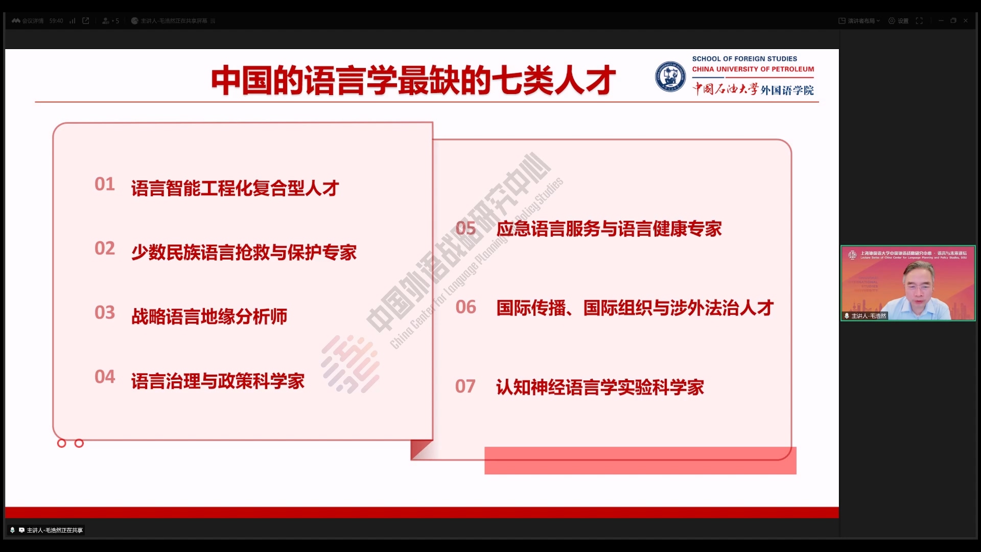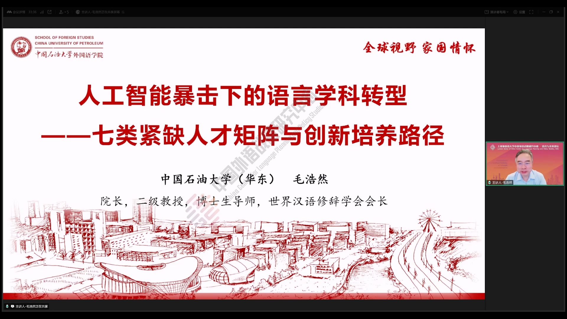 2025年4月10日,中国石油大学(华东)外国语学院院长毛浩然教授作客上海外国语大学“中国外语战略研究中心讲坛”,做了题为《人工智能暴击下的语言学科转型——七类紧缺人才矩阵与创新培养》的学术讲座。本次讲座由华东理工大学王陈欣博士主持,数百位校内外师生在线参加。