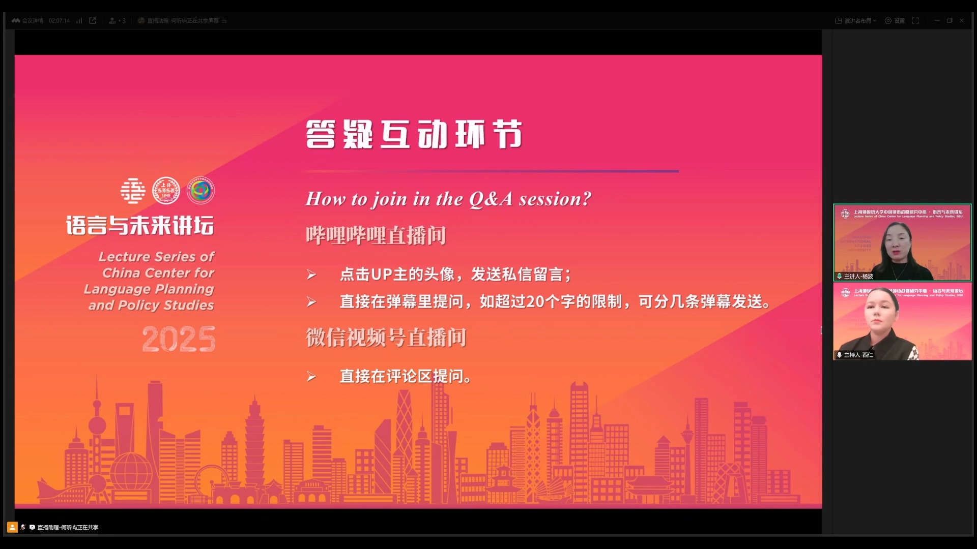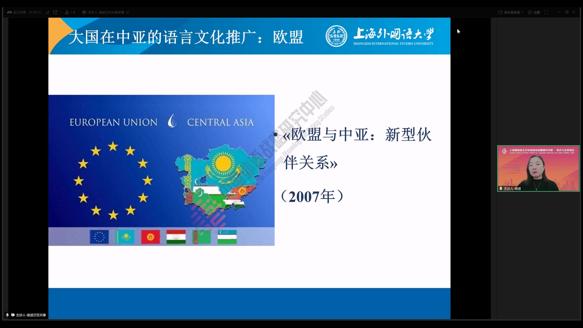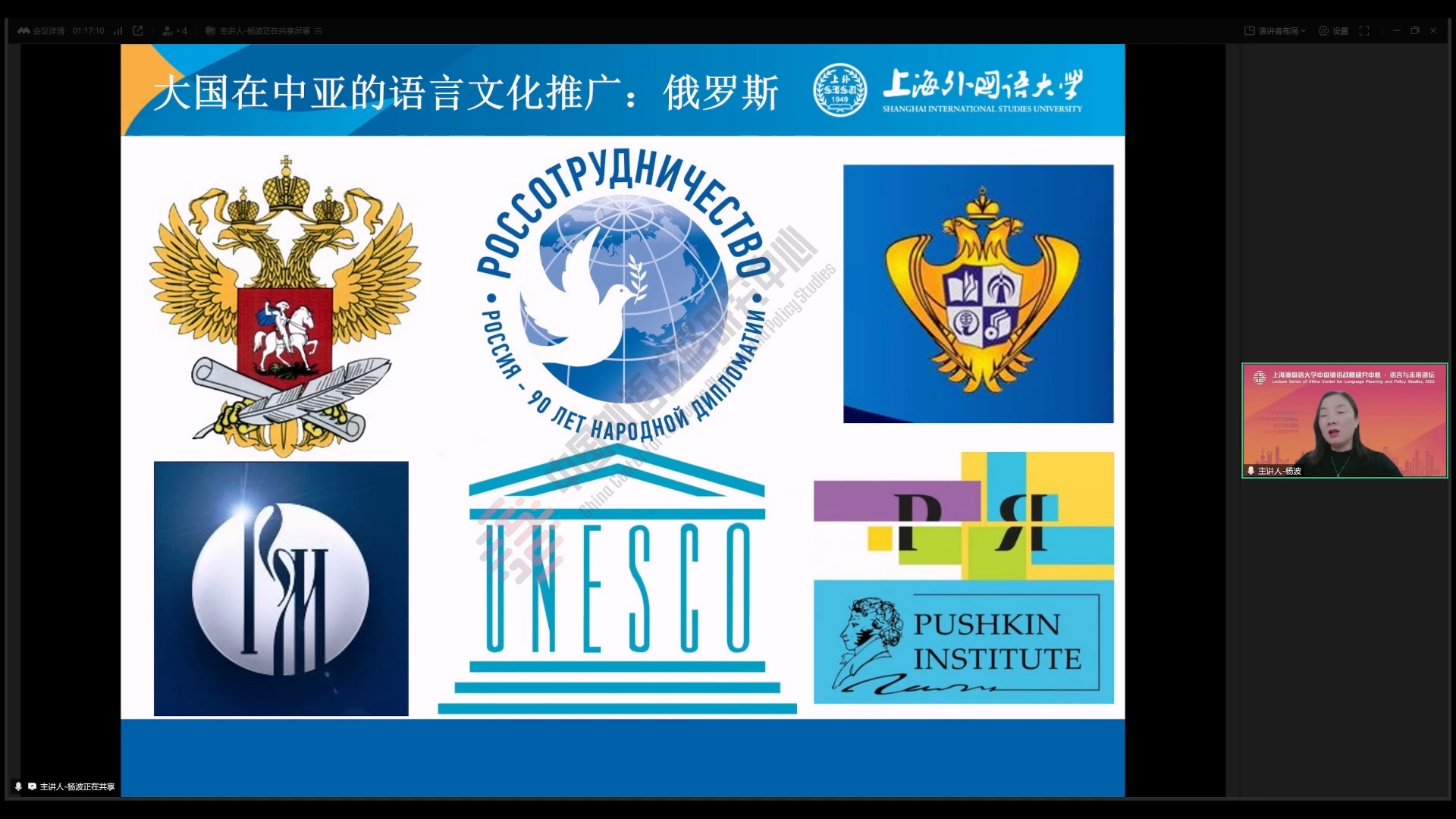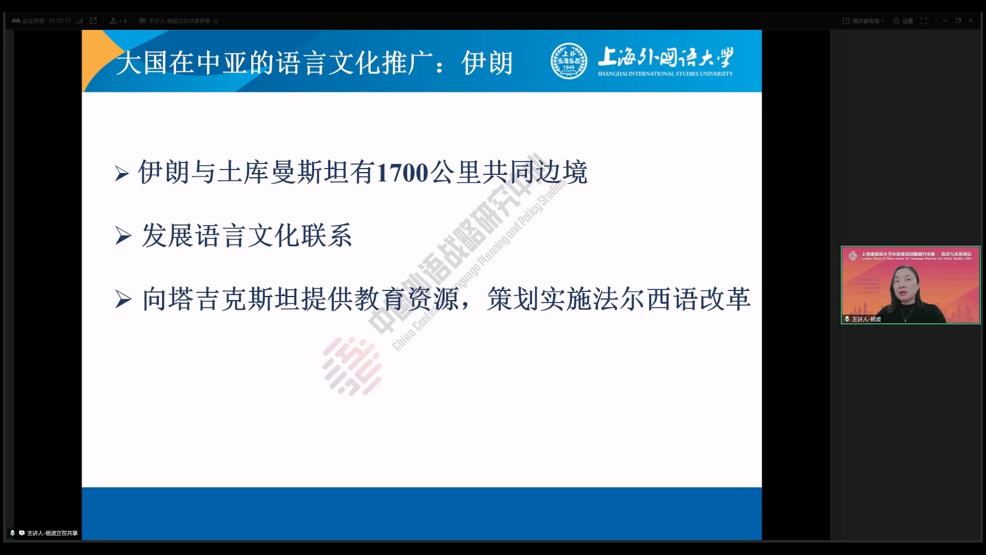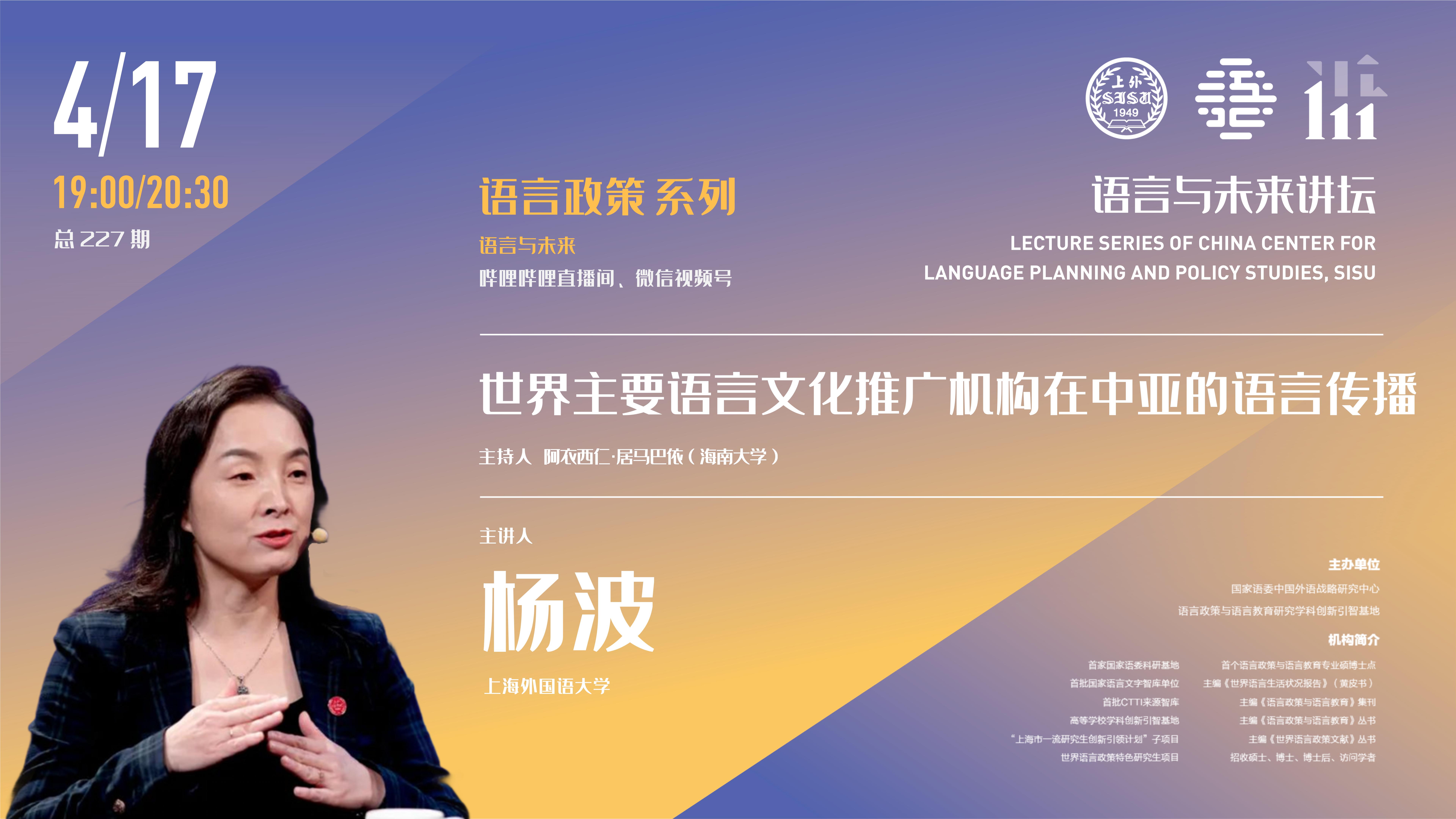 2025年4月17日,上海外国语大学高级翻译学院副院长杨波教授在中国外语战略研究中心“语言与未来讲坛”做了题为《世界主要语言文化推广机构在中亚的语言传播》的学术讲座。本次讲座由海南大学阿衣西仁·居马巴依副教授主持,数百名师生线上参加了本次讲座。