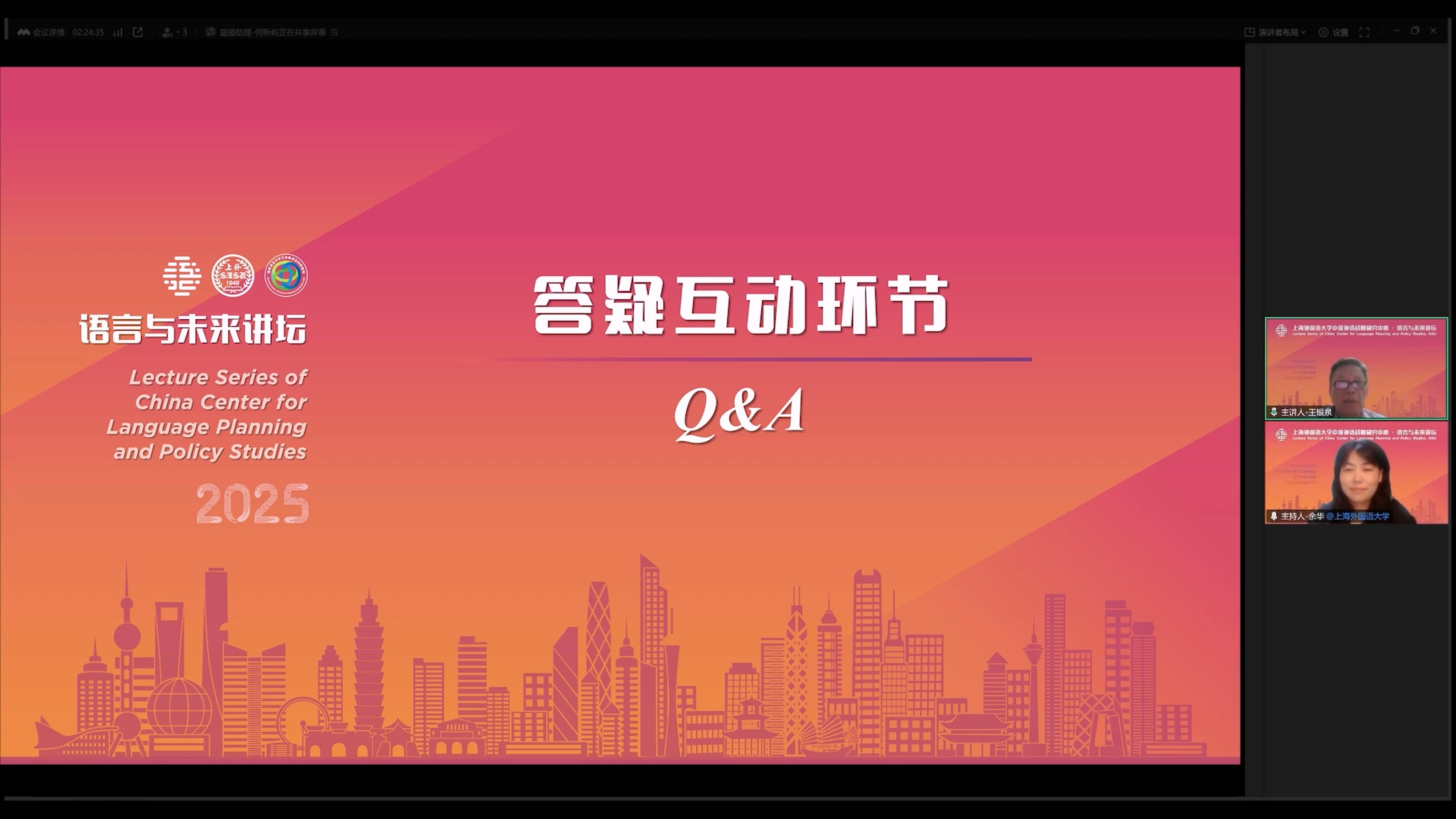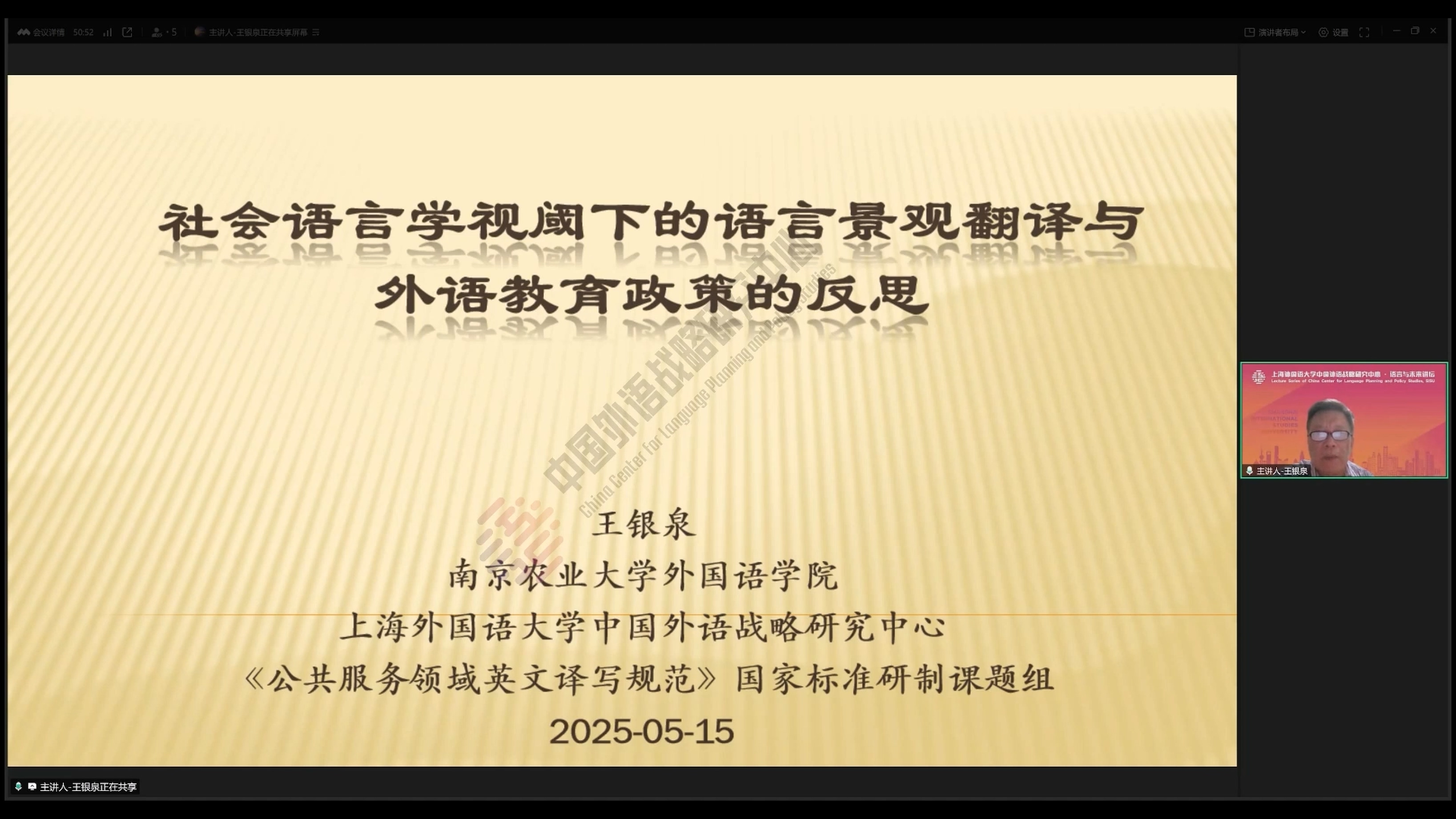 2025年5月15日,南京农业大学王银泉教授做客中国外语战略研究中心“语言与未来讲坛”,做了题为《社会语言学视域下的语言景观翻译与外语教育政策反思》的学术讲座。本次讲座由上海外国语大学中国外语战略研究中心副主任余华副教授主持,数百名师生线上参加了本次讲座。