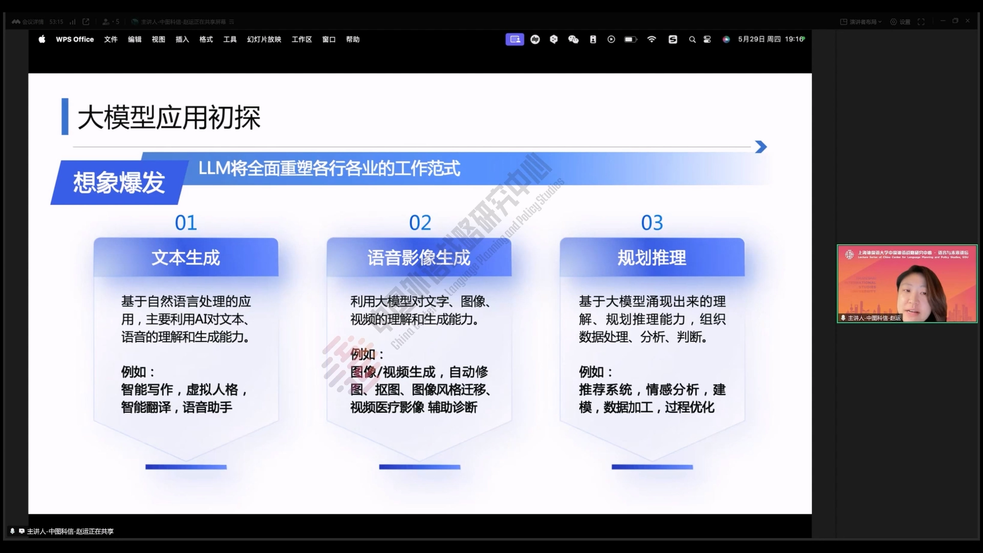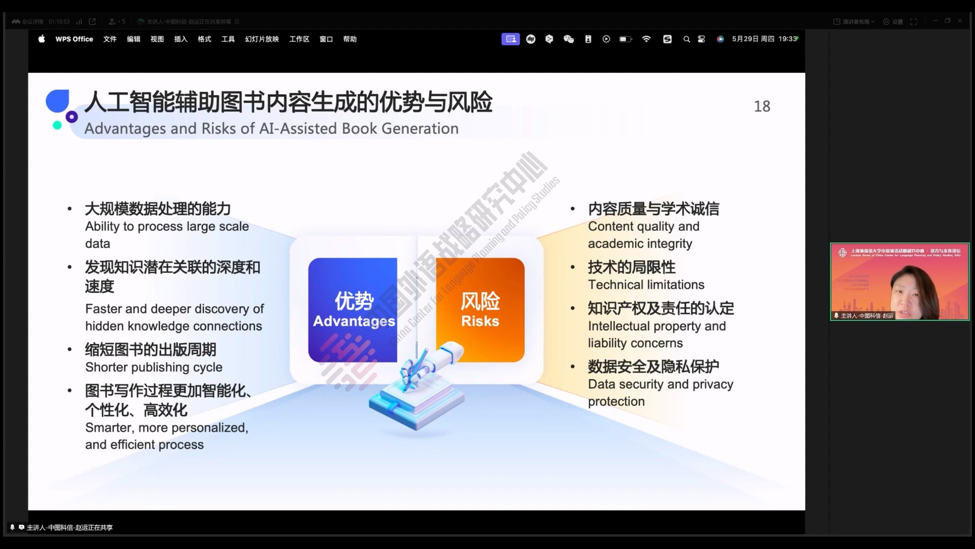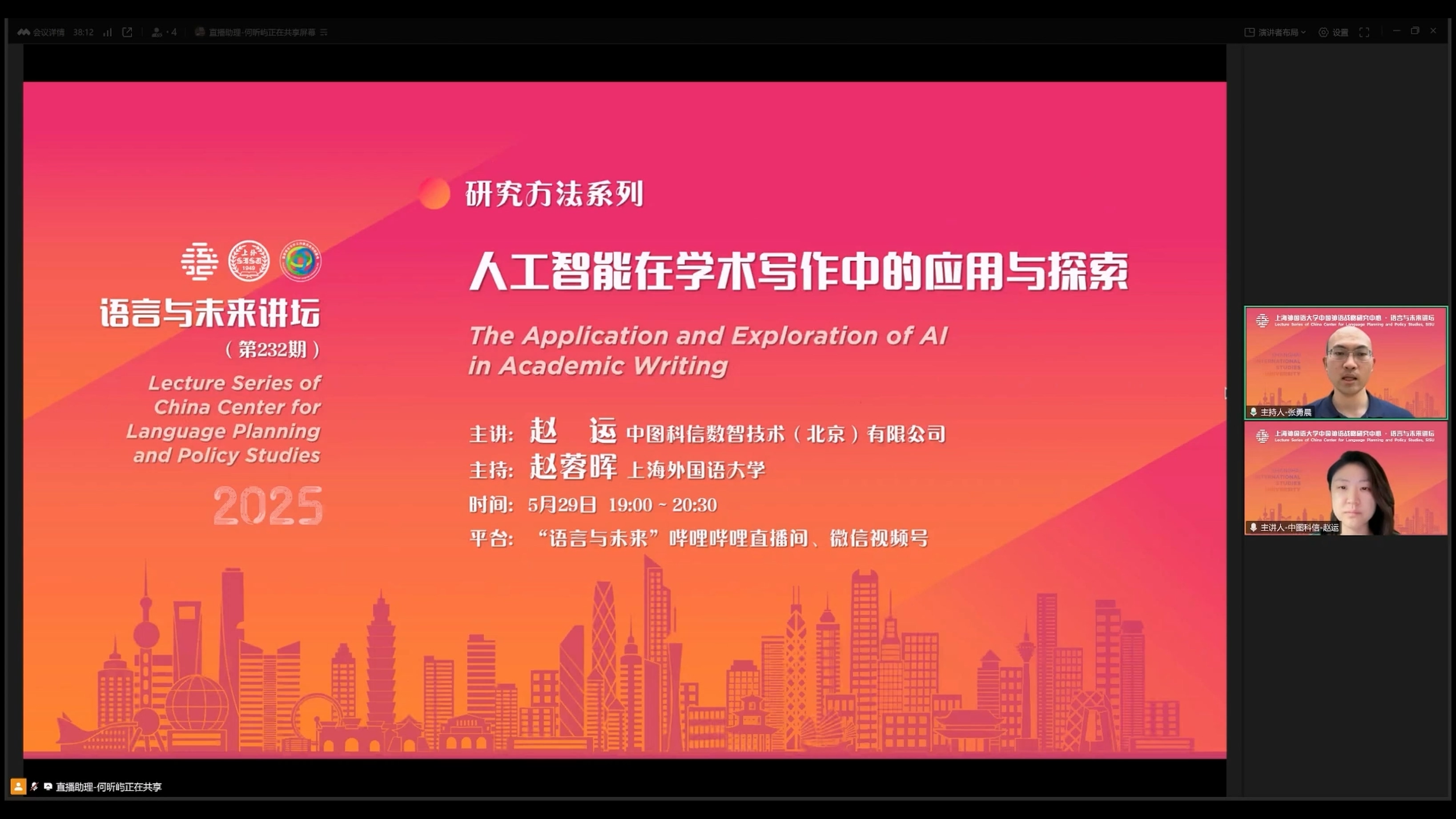 2025年5月29日,中图科信数智技术(北京)有限公司知识管理解决方案专家、上海外国语大学出站博士后赵运做客“语言与未来讲坛”,做了题为《人工智能在学术写作中的应用与探索》的学术讲座。本次讲座由上海外国语大学赵蓉晖教授主持,数百名师生线上参加了本次讲座。