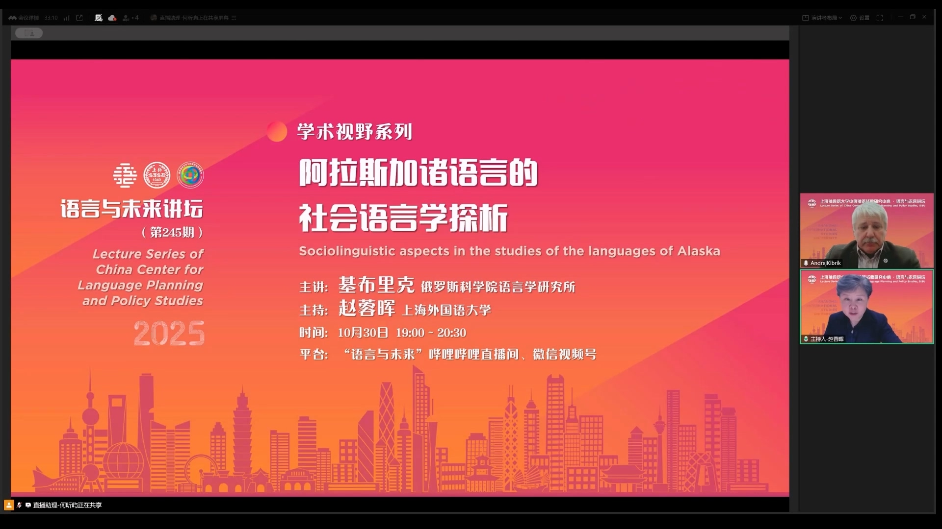 2025年10月30日,俄罗斯科学院语言学研究所基布里克教授做客中国外语战略研究中心“语言与未来讲坛”,做了题为《阿拉斯加诸语言的社会语言学探析》的学术讲座。本次讲座由中心执行主任赵蓉晖教授主持,百余位师生线上参加本次讲座。