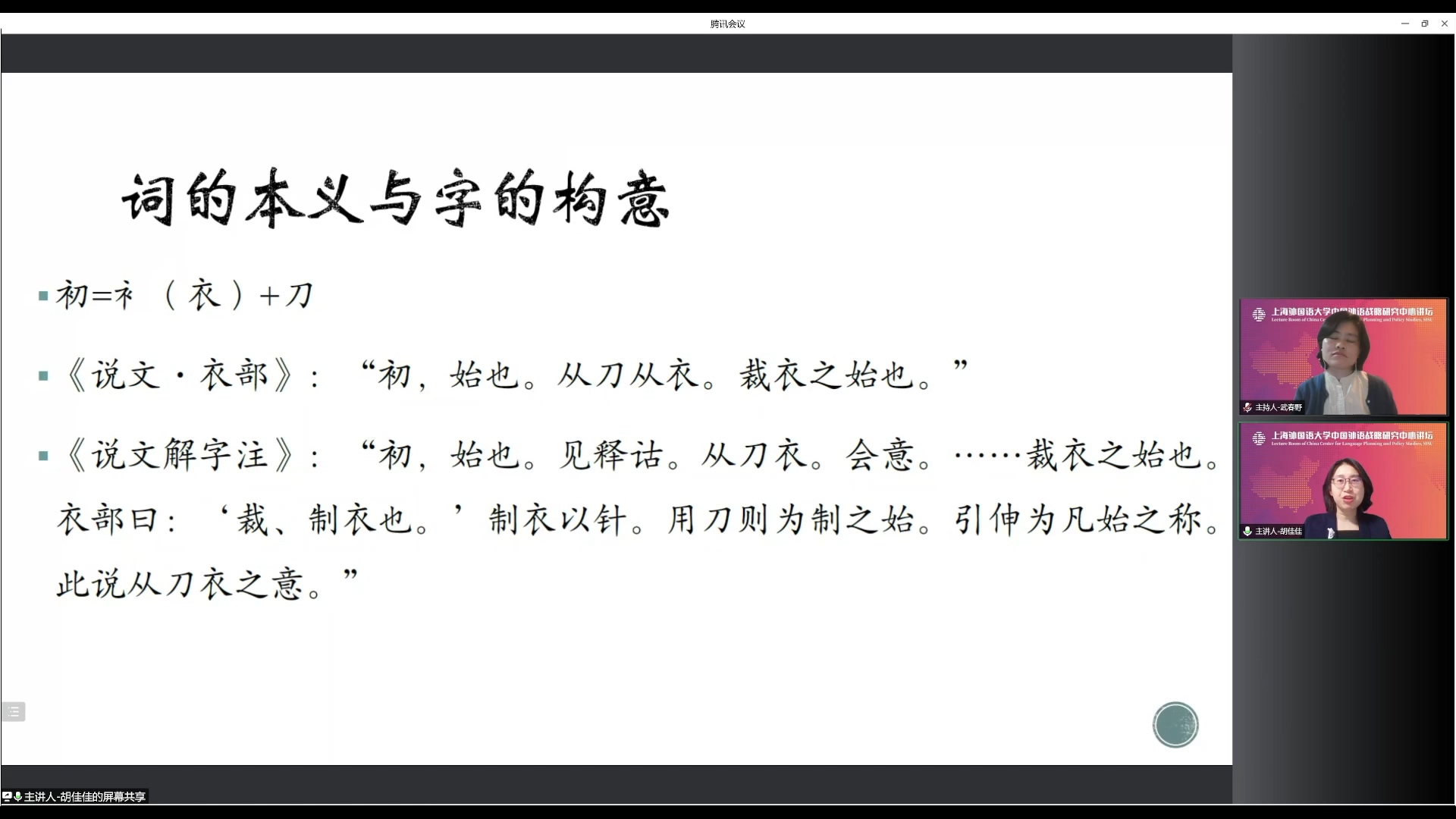 2022年4月28日晚,北京师范大学文学院副教授、中国文字整理与规范研究中心专职研究员胡佳佳于上海外国语大学举办的“中国外语战略研究中心讲坛”作了题为《汉语古今词义的沟通——利用汉字的意义》的学术讲座。讲座由中心研究员武春野主持,400余位校内外师生线上参加。