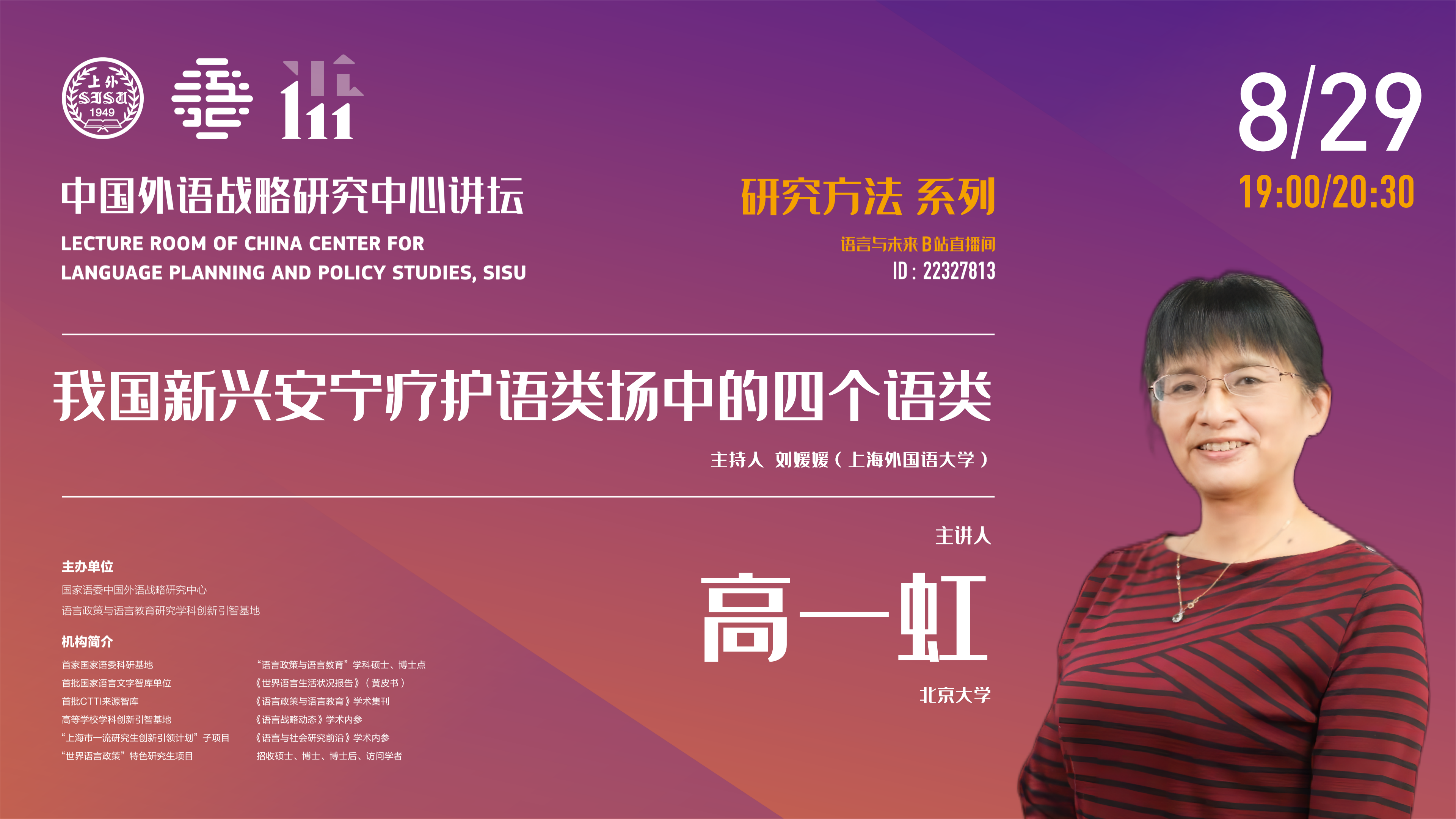 2022年8月29日,北京大学外国语言学院教授、博士生导师高一虹做客“中国外语战略研究中心讲坛”,做了题为《我国新兴安宁疗护语类场中的四个语类》的学术讲座。本次讲座由上海外国语大学刘媛媛老师主持,来自全国各大高校和研究机构的师生400余人以在线方式收看了本次讲座。