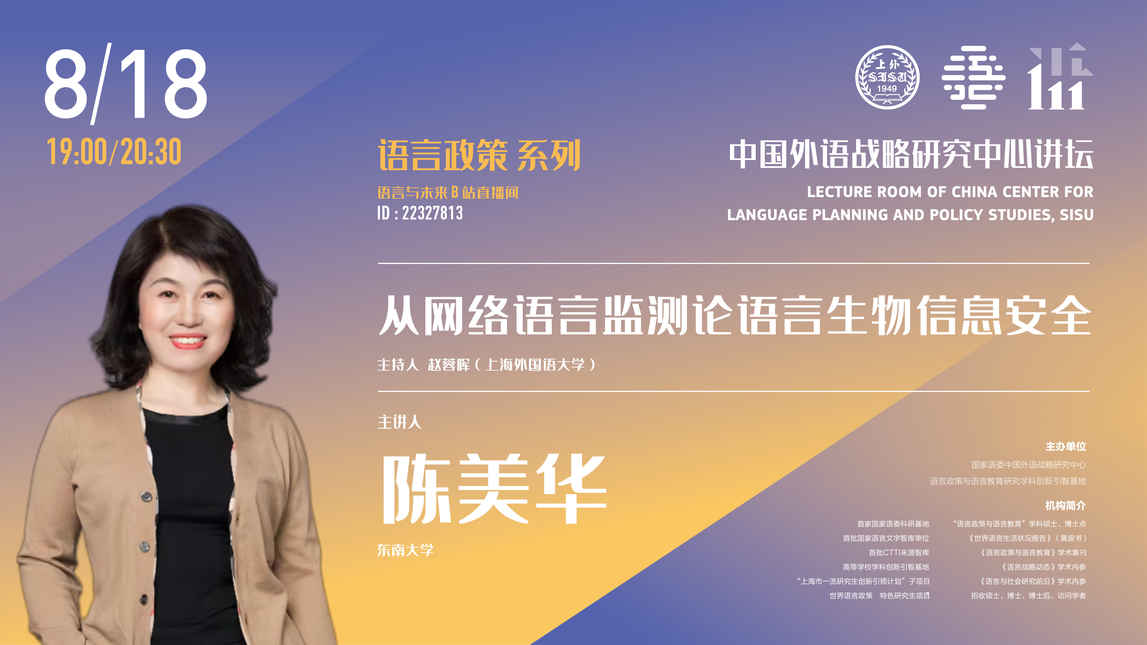 2022年8月18日,东南大学外国语学院院长、江苏高校国际问题研究中心—区域国别研究中心主任陈美华教授在“中国外语战略研究中心讲坛”作了题为《从网络语言监测论语言生物信息安全》的学术讲座。讲座由中国外语战略研究中心执行主任赵蓉晖教授主持,400余位校内外师生线上参加。