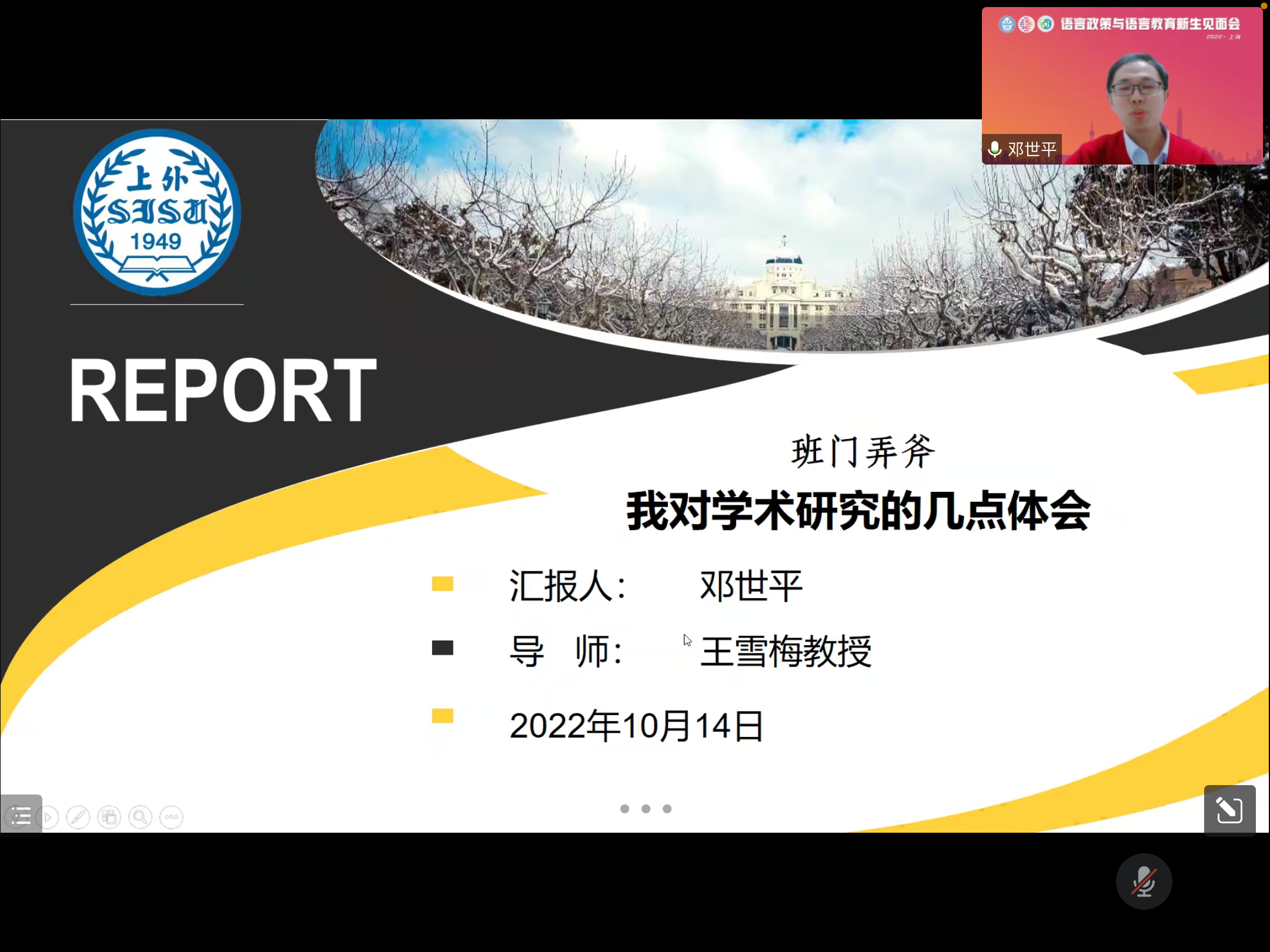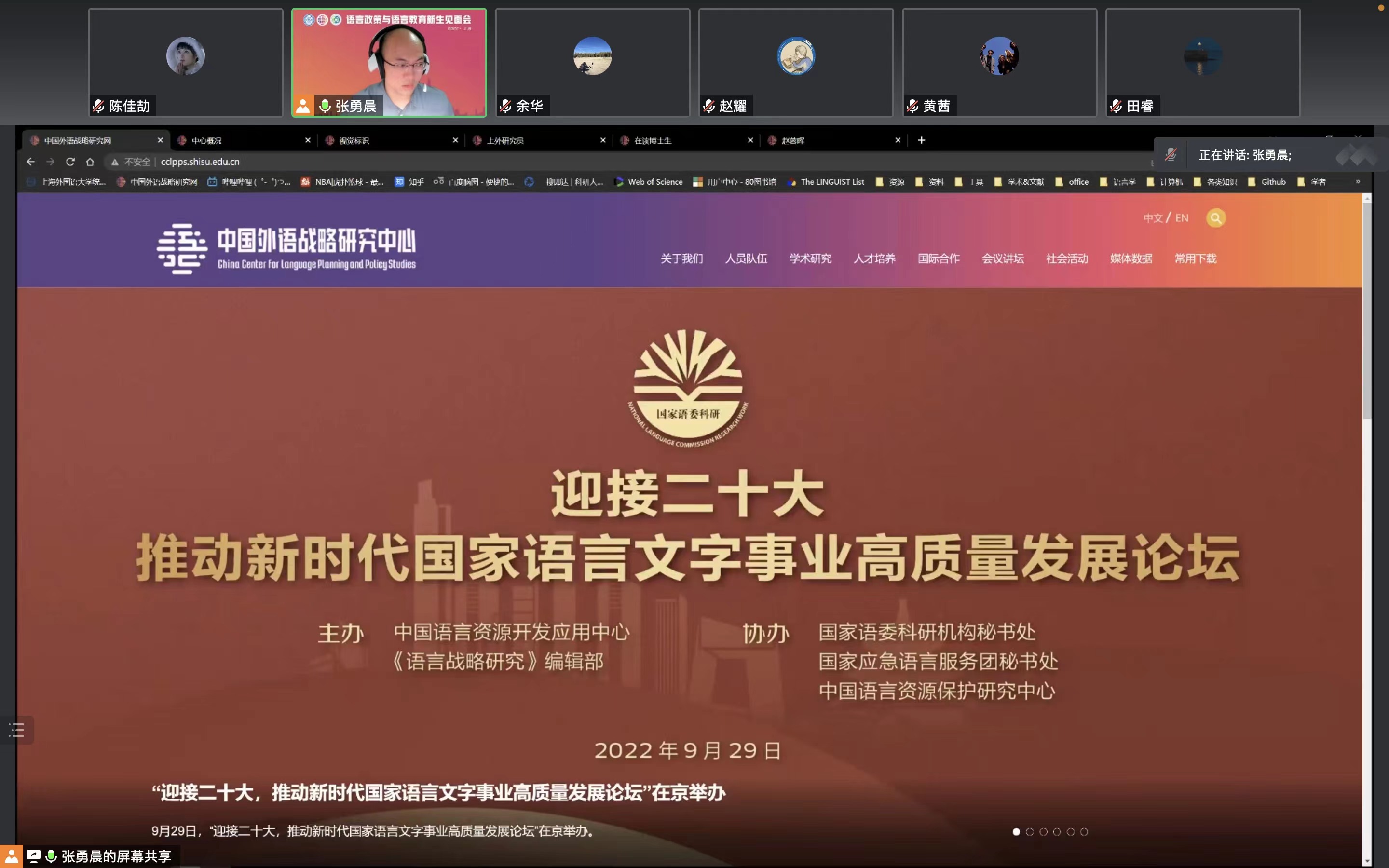 在老生代表分享环节。2019级博士生邓世平分享了自己关于学术研究的几点体会,从几种意识的培养、方向与选题的形成、方法与工具的运用、文章的修改与投稿以及中心的培养与资源五个方面进行了系统介绍。2020级博士生周洲介绍了黄皮书《世界语言生活状况报告》的相关工作,就基本情况、工作组提供的支持和写作事项展开了细致讲解,并鼓励感兴趣的同学参与其中。2019级博士生王陈欣讲解了目前学生工作的几大方面,如师生联络、信息收集和活动组织等,随后还介绍了上海市“啄木鸟”志愿者工作主要内容。2020级博士生赵耀介绍了新媒体和《语言战略动态》工作,对刊物的发展情况、目前编务团队的构成机制和招募信息作了讲解,随后介绍了中心讲坛目前的工作以及未来的发展目标,并希望有更多的同学能投入运营建设。2022级博士张勇晨向新生同学们就中国外语战略研究中心的网站建设展开介绍,从网站栏目的设置、基本的设计理念以及目前正在建设的部分作了详细展示。
