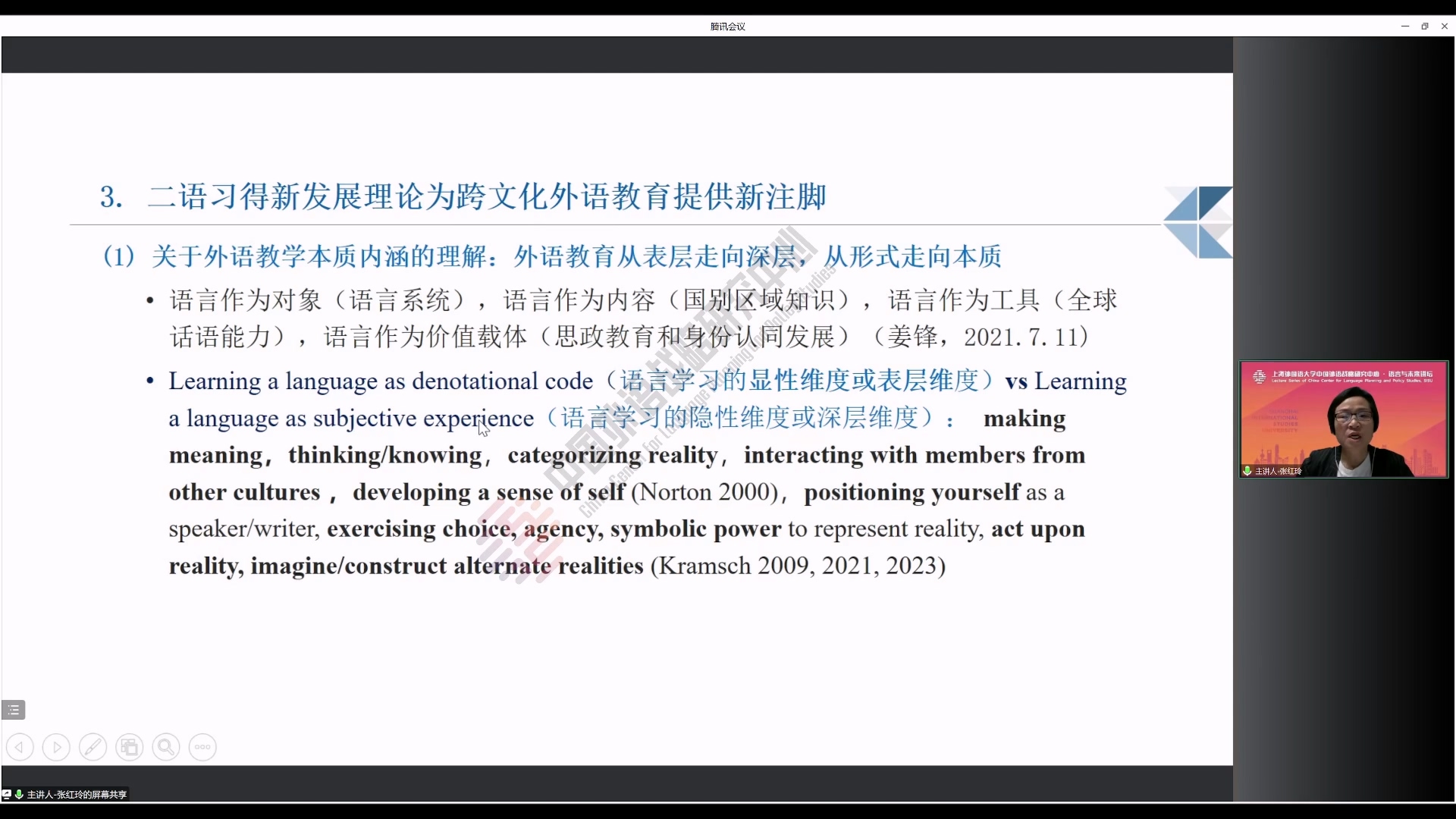 2023年6月15日晚,上海外国语大学跨文化研究中心主任、中国跨文化交流研究委员会副会长、美国富布莱特研修学者、明尼苏达大学和杜克大学访问学者张红玲教授做客中国外语战略研究中心的“语言与未来”讲坛,做了题为《跨文化外语教育新发展研究》的学术讲座。讲座由中心副主任朱晔教授主持,来自全国各大高校和研究机构的近500位师生在线参加。
