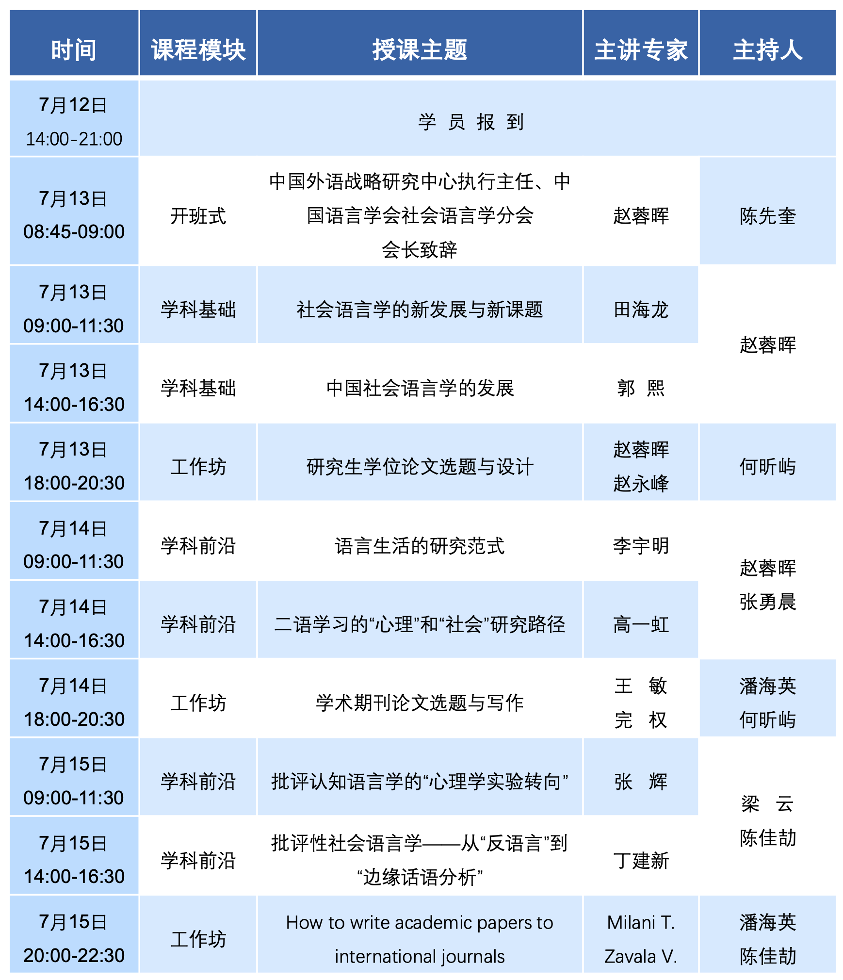 本年度研修主题为“新时代社会语言学研究”,学习内容分为两大部分:(1)社会语言学理论与前沿——将由田海龙、郭熙、李宇明、高一虹、张辉、丁建新等六位专家做六场专题报告,展示社会语言的基本理论与发展前沿;(2)学术论文选题与写作——将由赵蓉晖、赵永峰、完权、王敏、Tommaso Milani、Verginia Zavala等六位专家就研究生学位论文写作、中外期刊论文选题与写作做三场工作坊。本期书院还特别邀请了吉林大学潘海英教授、新疆师范大学梁云教授担任专家主持人。