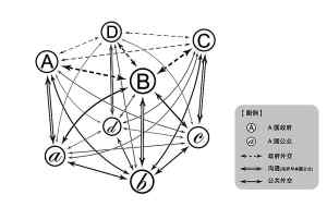 图一清楚地说明了由任何一个主体都有三个可能的出发方向,可以形成公共外交中各主体之间多种连锁的传递关系。如果再画入CD等许多国家,乃至形成世界各国的公共外交网络,如图二所示,此公共外交网络有可能促进联合国的政府外交的进展。