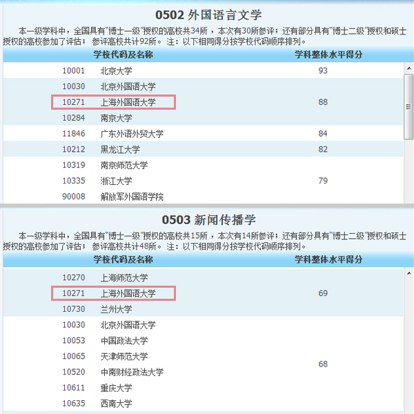 20131月29日上午,教育部公布了2012年学科评估结果,上海外国语大学外国语言文学学科整体水平得分为88分,在该学科92所参评高校中得分第2位(排名第2)。上海外国语大学新闻传播学学科整体水平得分为69分,在该学科48所参评高校中得分第11位(排名第27)。