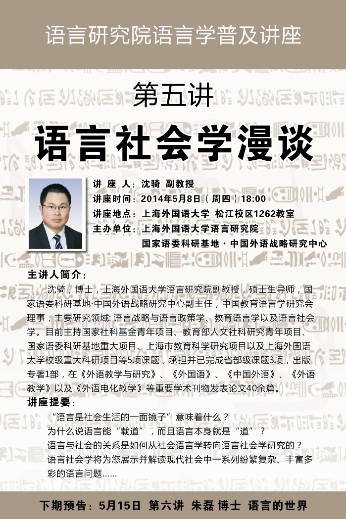 沈骑,博士,上海外国语大学语言研究院副教授,硕士生导师,国家语委科研基地·中国外语战略研究中心副主任,中国教育语言学研究会理事,主要研究领域:语言战略与语言政策学、教育语言学以及语言社会学。目前主持国家社科基金青年项目、教育部人文社科研究青年项目、国家语委科研基地重大项目、上海市教育科学研究项目以及上海外国语大学校级重大科研项目等5项课题,承担并已完成省部级课题3项,出版专著1部,在《外语教学与研究》、《外国语》、《中国外语》、《外语教学》以及《外语电化教学》等重要学术刊物发表论文40余篇。