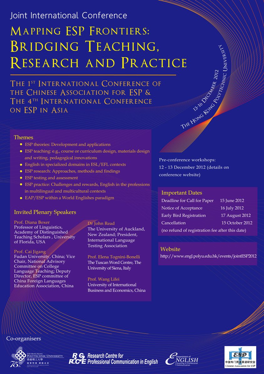 Following the success of the 1st Asian ESP Conference held at Chongqing University in October 2009, the 2nd ESP in Asia Conference at University of Nottingham Ningbo China in October 2010, and the 3rd International Conference on ESP in Asia Xi’an Jiaotong University in October 2011, we are very pleased to announce that the 4th International Conference on ESP in Asia, in conjunction with the 1st International Conference of the Chinese Association for ESP, will be held at The Hong Kong Polytechnic University, Hong Kong SAR, on 13-16 December 2012. The theme of the conference is ‘Mapping ESP Frontiers: Bridging Teaching, Research and Practice’.