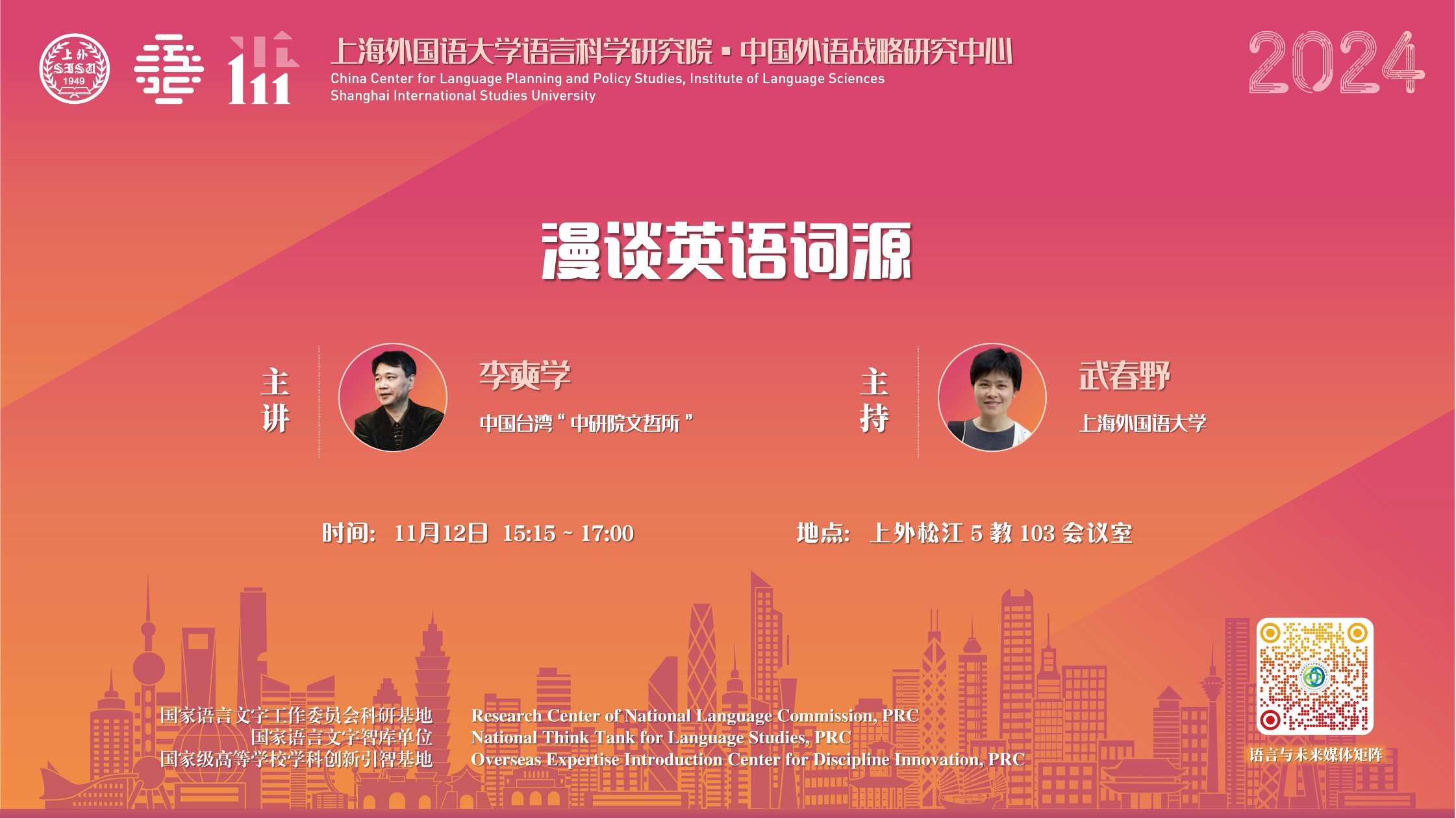 2024年11月12日至14日,中国台湾“中研院文哲所”特聘研究员、台湾师范大学翻译研究所合聘教授、台湾辅仁大学跨文化研究所校聘讲座教授李奭学老师莅临上海外国语大学,为上外师生带来了三场讲座。讲座由上海外国语大学语言科学研究院、国家语委科研基地中国外语战略研究中心承办。讲座围绕“语言与社会变迁”为主题展开,为师生呈现了一场融合语言学、文学、翻译史、中西文化交流史的学术盛宴。
