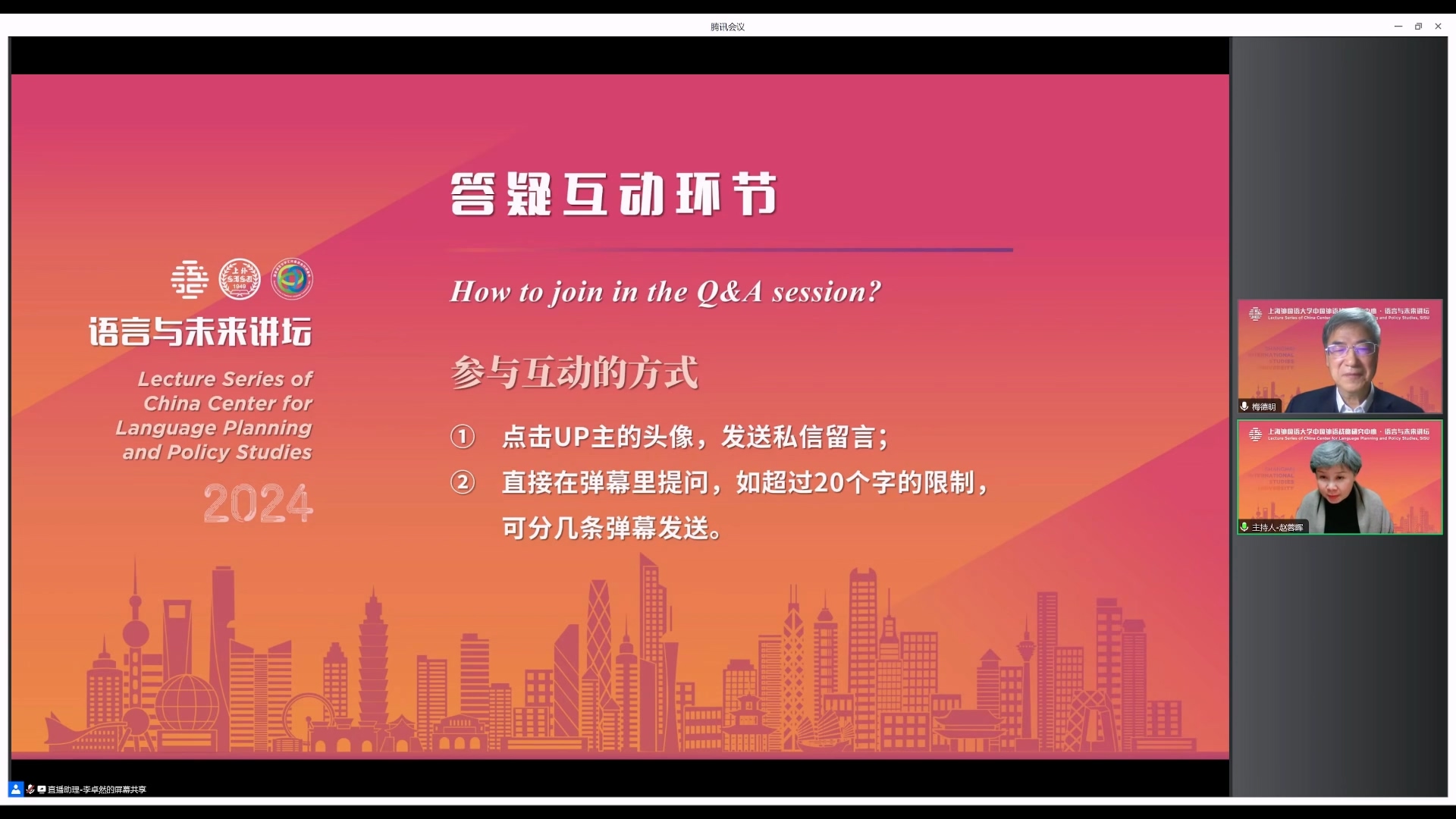 在讲座最后的互动交流环节,梅教授详细回答了听众们提出的“目的语文化与中华文化的平衡”“在不同学段外语教材里中华文化的融入与呈现”等问题,指出外语教材建设应有机融入中国情怀、国际视野、文化品格、人文素养、思维品质等要素,帮助学生树立正确的国家观、历史观、民族观和文化观。