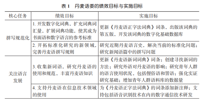 2021—2024年,丹麦语委有七个具体的绩效目标,其中,两个与拼写标准有关、两个与语言监测有关、两个与信息服务有关、一个与手语服务有关。这些绩效目标以《丹麦语言委员会法》为基础,是《协议》中使命内容的延伸。每个绩效目标都有对应的未来四年的实施目标,是对绩效目标的具体化(见表1)。
