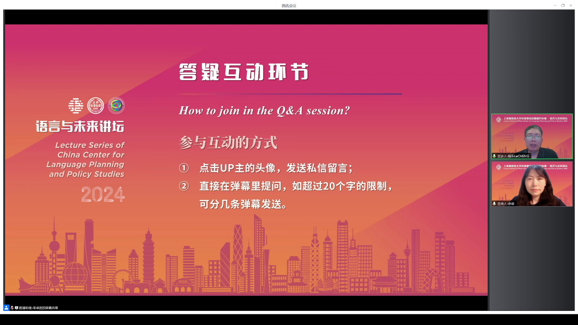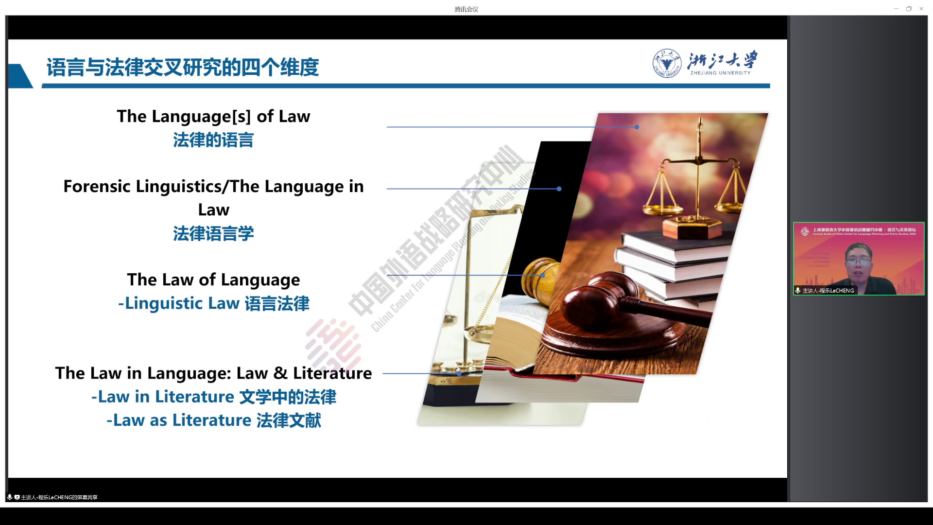 2024年5月30日,浙江大学光华法学院、网络安全学院、外国语学院程乐教授做客中国外语战略研究中心“语言与未来”讲坛,做了题为《语言与法律:回顾与展望》的学术讲座。讲座由上海外国语大学中国外语战略研究中心余华副教授主持,400余位校内外师生在线参加。