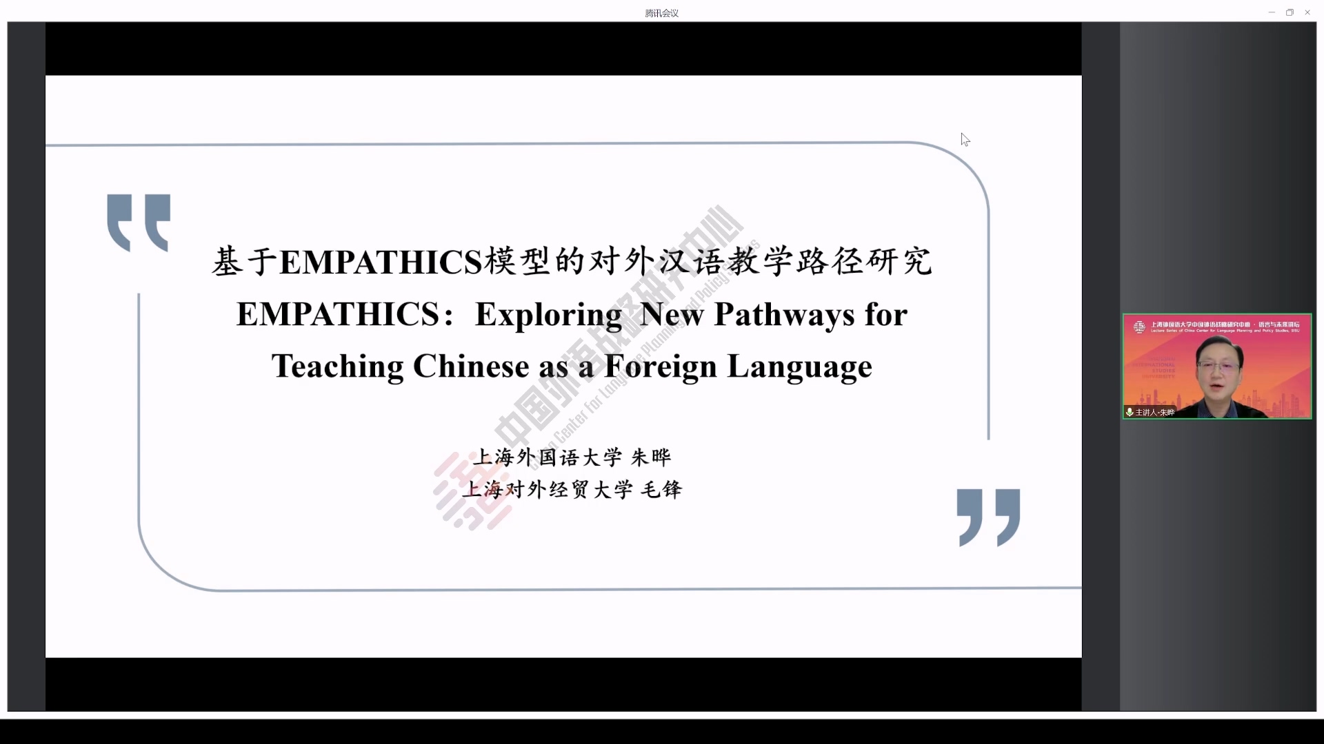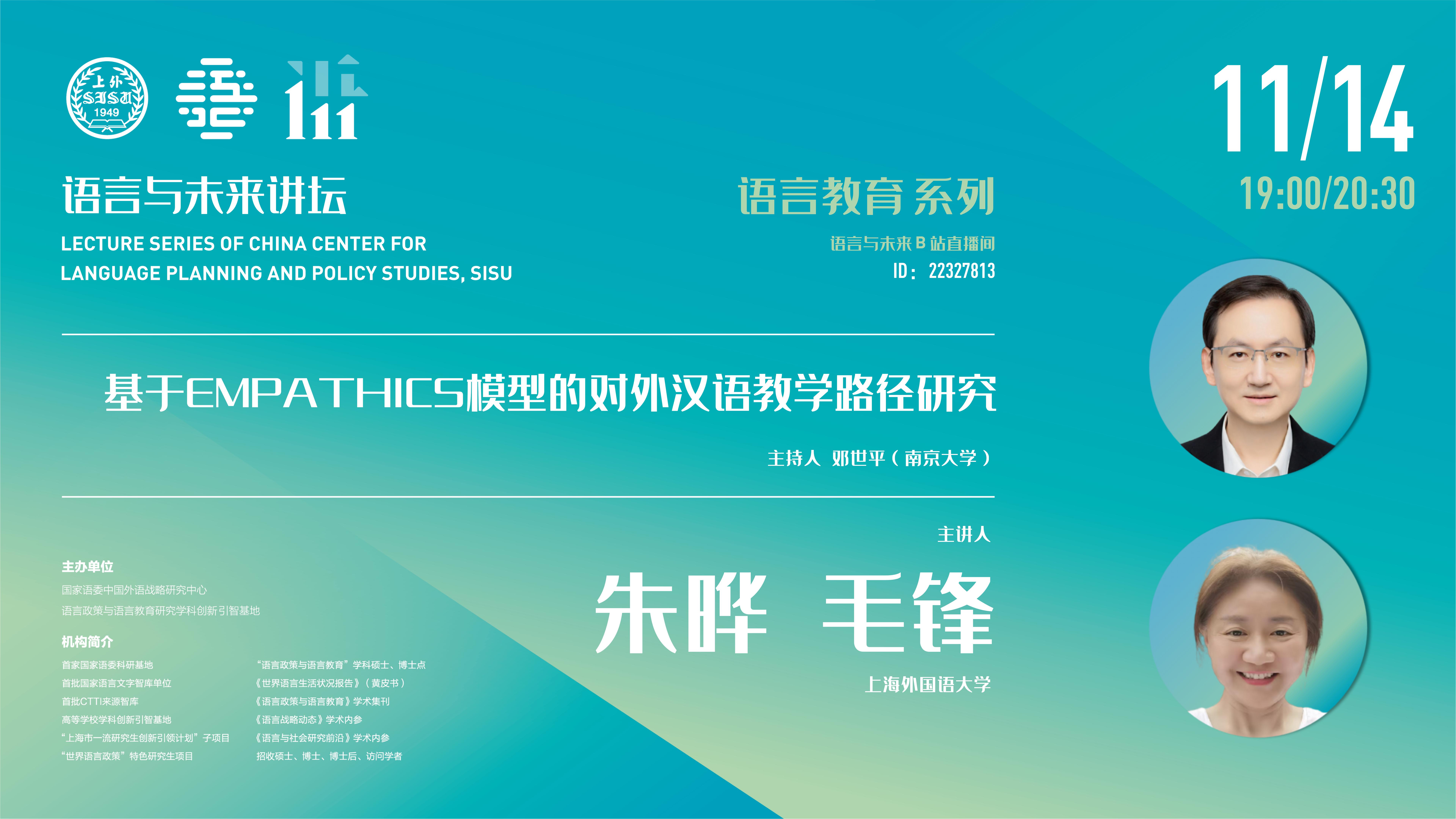 2024年11月14日,上海外国语大学教授、博士研究生导师,国家语委科研基地、国家语言文字智库中国外语战略研究中心副主任朱晔教授,以及上海对外经贸大学副教授、译审、语言政策与语言教育专业博士生毛峰副教授做客中国外语战略研究中心“语言与未来讲坛”,做了题为《基于EMPATHICS模型的对外汉语教学路径研究》的学术讲座。讲座由南京大学邓世平副教授主持,本场讲座首次用微信视频号和 b 站进行双平台直播,1100余位师生线上参加了本次讲座。