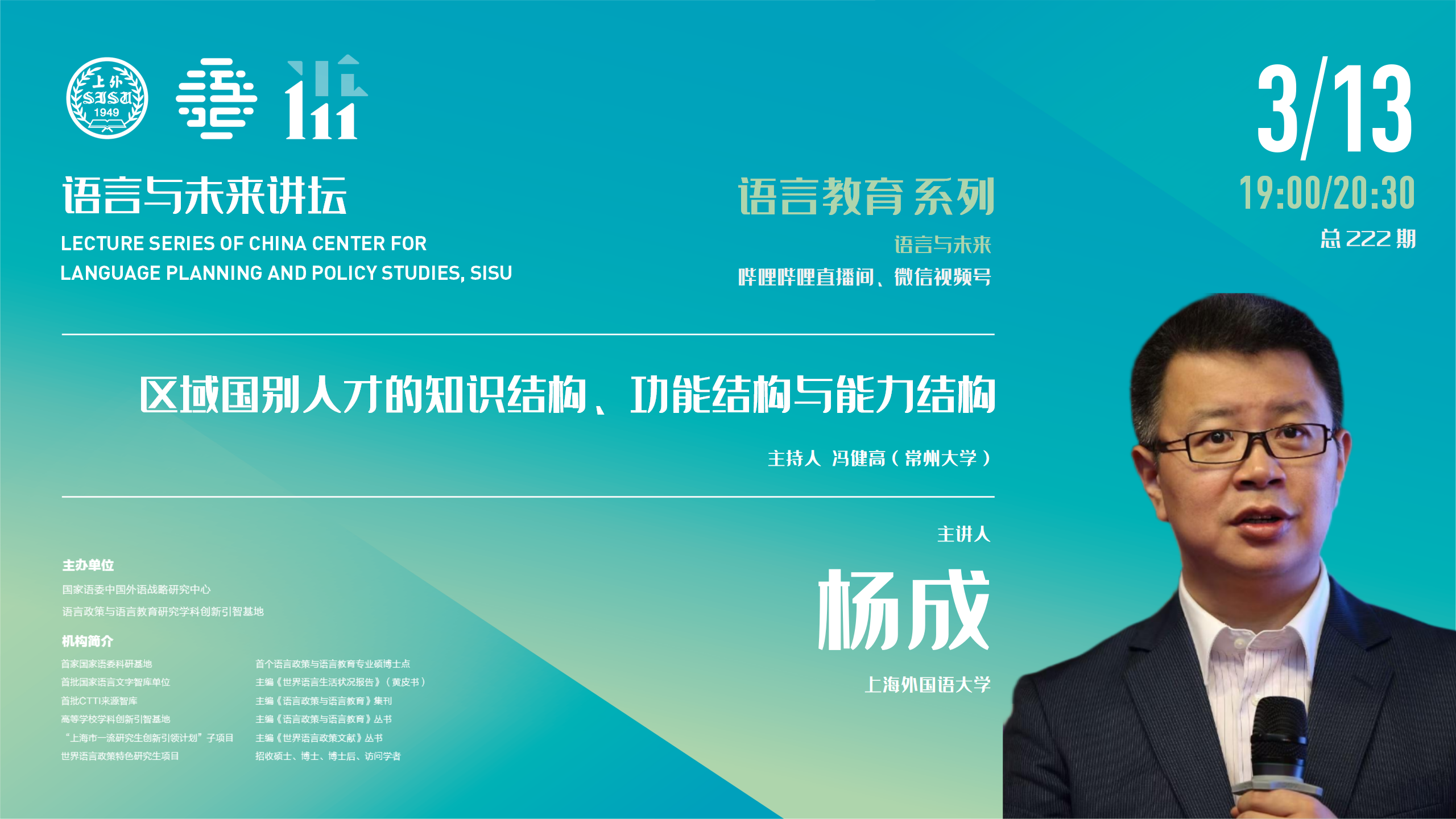 2025年3月13日,上海外国语大学杨成教授做客“语言与未来”讲坛,发表了题为《区域国别人才的知识结构、功能结构与能力结构》的学术报告。本次讲座由常州大学冯健高副教授主持,1300余位观众在线参加了本次讲座。